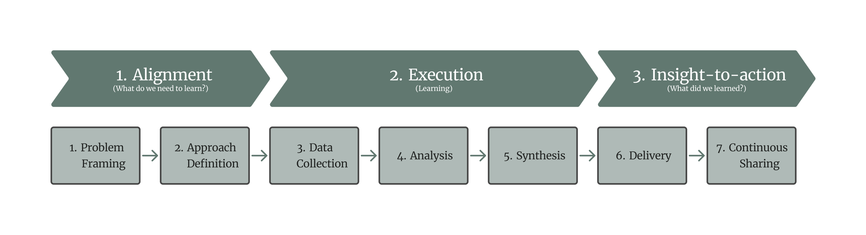 It was clear that we were reliable at technical execution of the projects. So we focused on adjacent activities and came up with a seven-step research process organized into three phases: