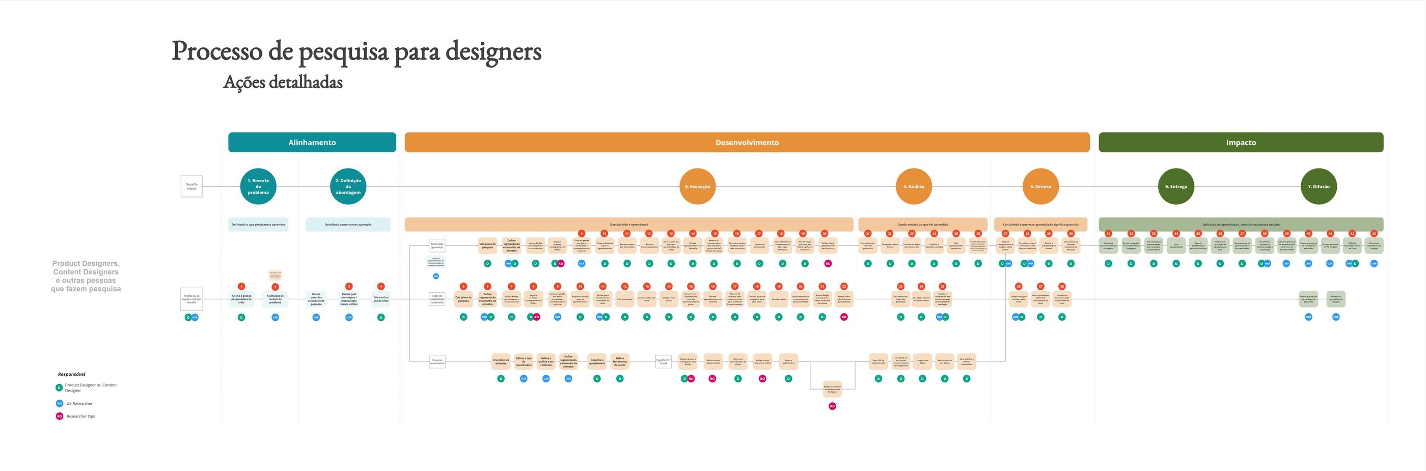 A complete research process flowchart with each action and its owner—researcher or designer